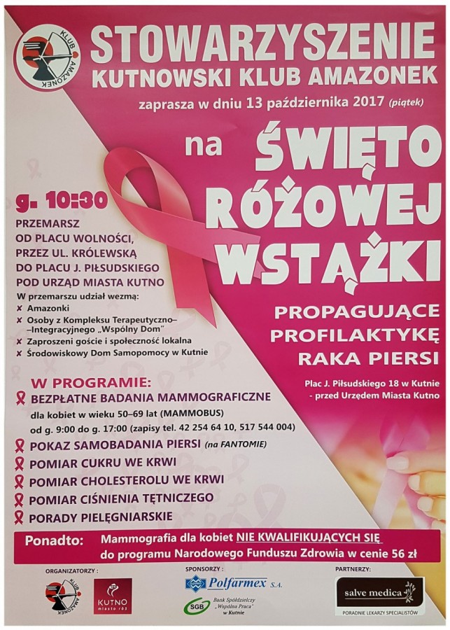Kutnowski Klub Amazonek oraz Polfarmex S.A. zapraszają na coroczną edycję Święta Różowej Wstążki. Ma ono na celu promocję profilaktyki raka piersi oraz zachęcenie do korzystania z regularnej diagnostyki medycznej.