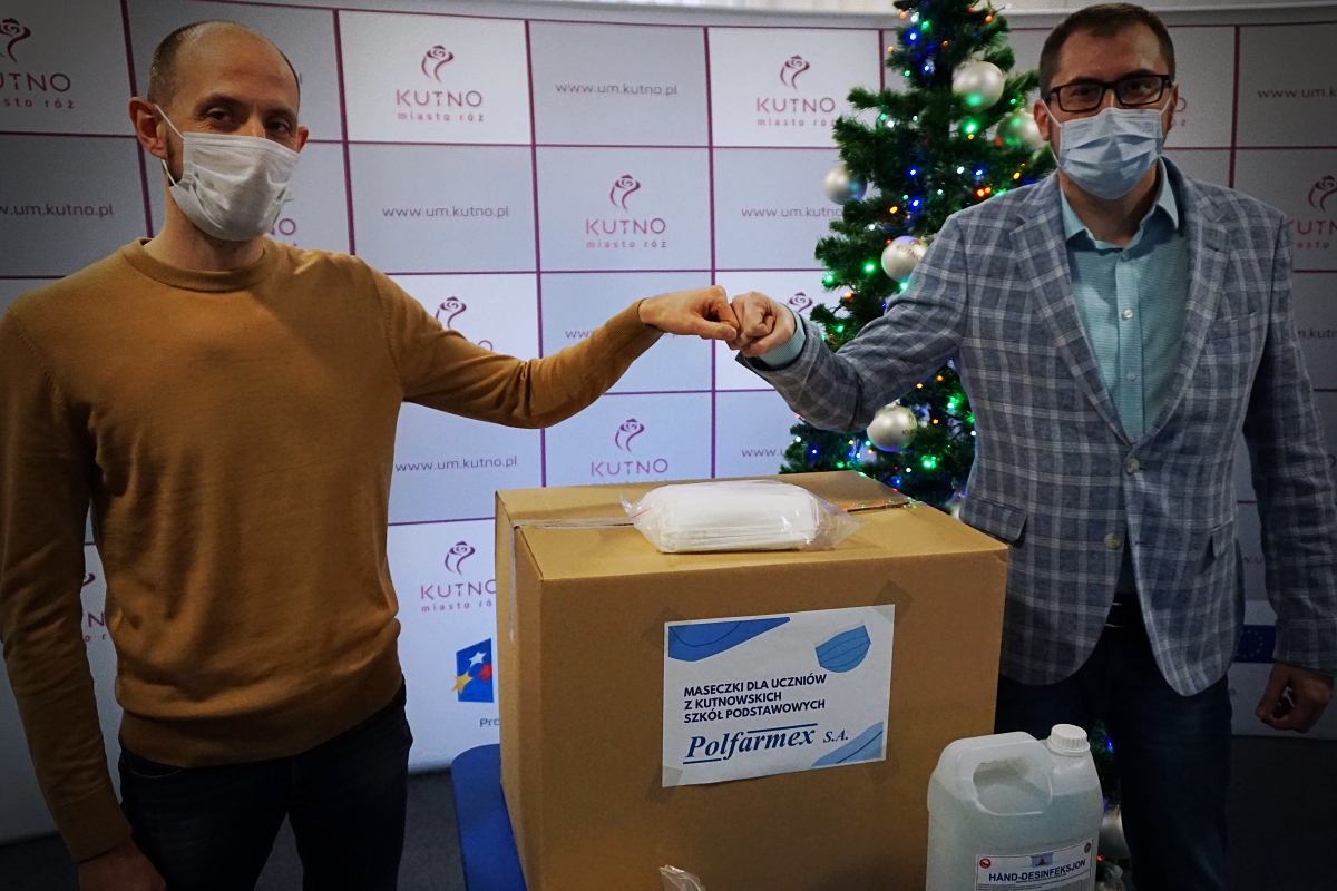 Sześć tysięcy maseczek oraz trzysta pięćdziesiąt litrów płynu do dezynfekcji rąk Polfarmex S.A. przekazał kutnowskim szkołom podstawowym. Przekazane środki ochrony osobistej pomogą wzmocnić bezpieczeństwo uczniów podczas nauki stacjonarnej, do której mają powrócić po 10 stycznia 2022 roku. Wartość przekazanego wsparcia to ponad 8 tysięcy złotych.